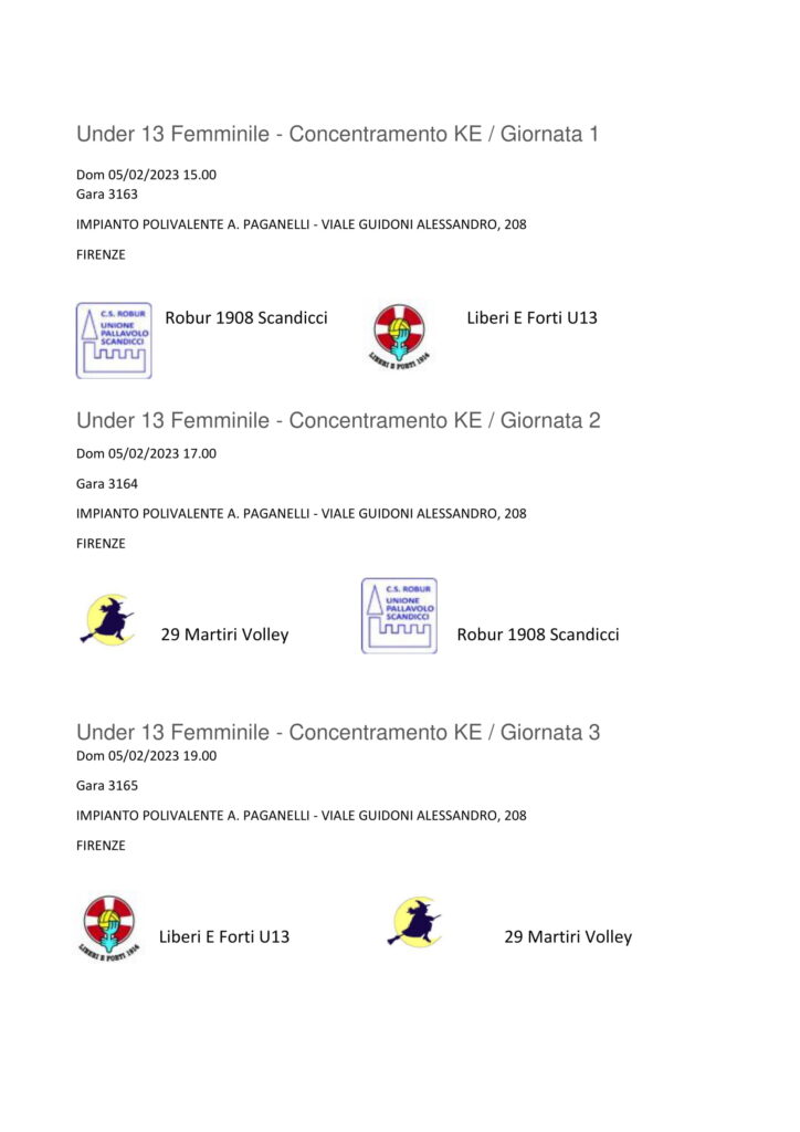 Domenica 5 febbraio a Firenze palestra A. Paganelli via Alessandro Guidoni la nostra Under 13 Fipav Femminile si giocherà la qualificazione per le finali di categoria in un gironcino a tre squadre Con la Robur Scandicci 1908 e la Liberi E Forti. Una sola squadra di queste tre proseguirà il cammino per la finale territoriale.
